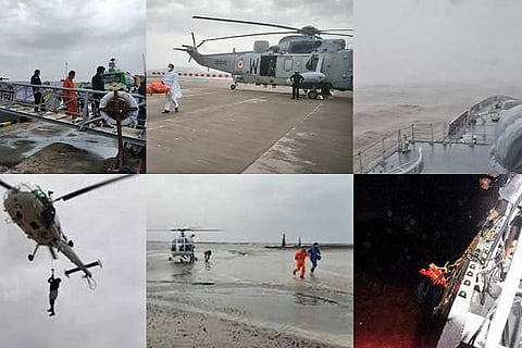Off the Gujarat coast, INS Talwar had assisted Support Station 3 and Drill Ship Sagar Bhushan, which are now being safely towed back to Mumbai by ONGC support vessels. Food and water to the 300 odd crew members of these vessels were also provided by the naval helicopters from Mumbai.
