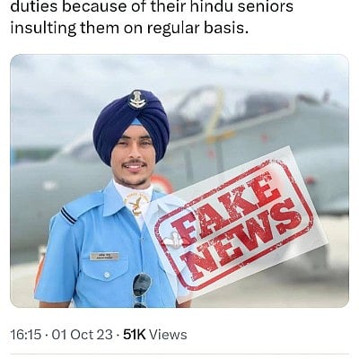 New Delhi: The Indian Air Force (IAF) on October 2 in a post on X (formerly Twitter), busted the fake news doing rounds on social media with the claim that the “majority of Sikh pilots and personnel were refusing to perform their duties because of their Hindu seniors insulting them on regular basis.”