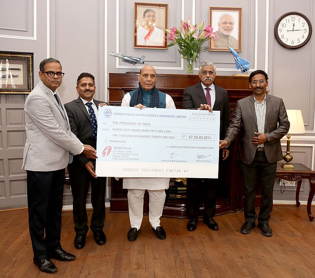 The Interim Dividend Cheque amounting to Rs. 67.59 Crore as the government’s share was handed over to Defence Minister Rajnath Singh, by Cmde P R Hari, IN (Retd), Chairman & Managing Director of GRSE Ltd. Kolkata on 01 March, 2024 in New Delhi in the presence of Defence Secretary Giridhar Aramane.